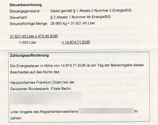 Sad ono najzanimljivije. Njemački carinici su se pozvali na član 44. lokalnog poreskog zakona, prema kojem se porez može nametnuti svakom licu “umiješanom u nepravilnosti”. Ovo učešće uključuje i vožnju kamiona, pa se stoga vozač definiše kao solidarno obveznik akcize. Za svaki litar tereta naplaćeno mu je 470 eura poreza, što je iznosilo 14,9 hiljada eura. euro. Definisano je kao da zahtijeva hitnu naplatu, uz najavu da će se za svaki mjesec kašnjenja obračunavati kamata od 1 posto.